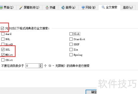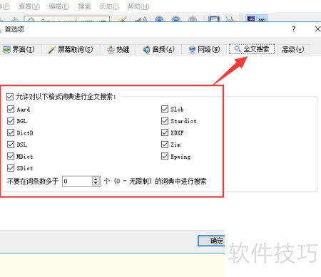 7、 这是极为关键且易被忽略的步骤,常引发各类问题。进入→→,根据实际需要,选择关闭全文搜索功能,或设定仅对特定一种或多种格式的词典进行全文搜索,以提升效率并避免资源浪费。