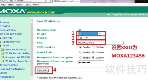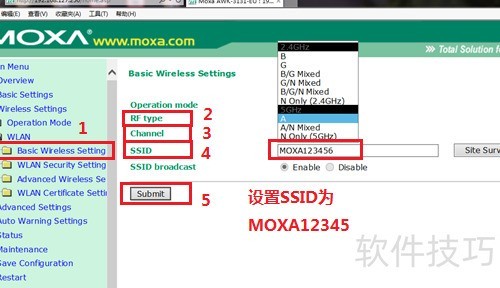 6、 接着展开WLAN菜单,选择Basic Wireless Settings进行无线基本配置。在此处需确保客户端所设的无线频段与目标接入点(AP)保持一致,包括SSID名称和频段选择。例如,若AP工作在5GHz频段,则此处也应选择相应的5GHz A频段模式,设置完毕后再次点击Submit保存。
