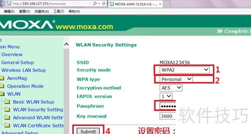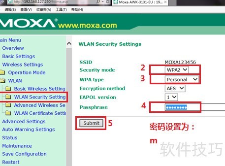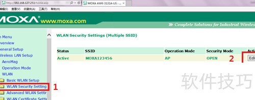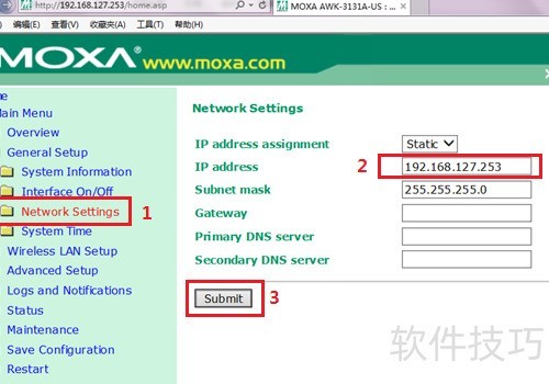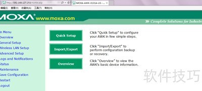 4、 待设备重启完成后,在电脑浏览器地址栏中输入默认管理地址:192.168.127.253,按下回车键进入AWK-3131-EU的Web管理界面。登录时使用的用户名为admin,密码为moxa。成功登录后进入系统参数设置页面。
