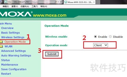 5、 首先进行工作模式设定。进入Wireless Settings菜单下的Operation Mode选项,将设备的工作模式更改为Client客户端模式,设置完成后点击页面左下方的Submit按钮提交保存。