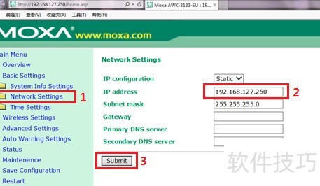 8、 最后进入Basic Settings中的Network Settings网络配置项,为客户端设备指定静态IP地址,建议设置为192.168.127.250,子网掩码等参数根据实际网络环境合理配置,完成后点击Submit保存更改。