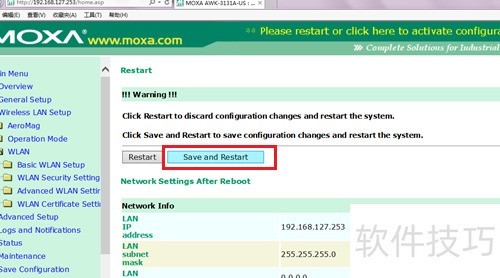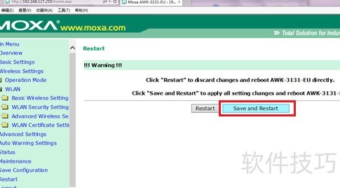 9、 所有参数配置结束后,点击页面上的Save and Restart按钮,系统将保存当前配置并重新启动。整个重启过程大约持续30秒左右,待设备重启完成后即可开始后续通信测试与应用部署。