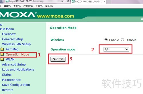 11、 将AP的IP地址设为192.168.127.253,点击提交。将AWK-3131A-EU设备切换至AP模式。进入基本无线网络设置界面,完成相关配置,确保设备正常工作并建立稳定的无线连接。