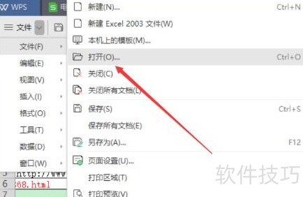 2、 以WPS为例,安装并启动软件后,点击左上角文件菜单中的打开,或直接使用Ctrl+O快捷键,即可弹出文件选择窗口,快速导入所需文档。
