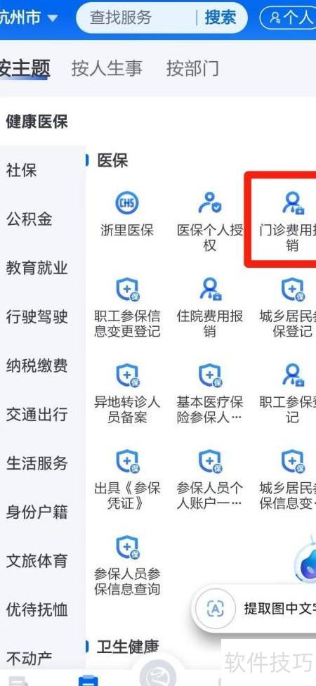 2、 进入健康医保页面,选择门诊费用报销功能。