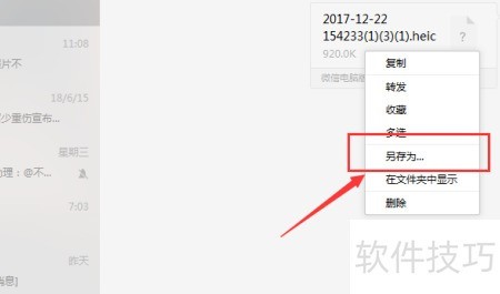2、 打开微信的文件传输助手,将HEIC格式图片发送至电脑。接着右键点击图片,选择另存为,即可将其保存到指定文件夹中。