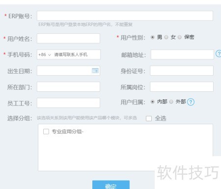 6、 输入ERP账号、姓名及手机号,选择专业分组后点击确定,即可完成云账号添加。