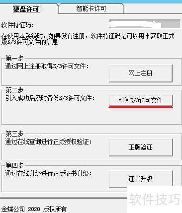 11、 进入软件许可申请页面,点击后选择引入K/3许可文件,在新窗口中找到并选中从云平台下载并解压后的.dat格式许可文件,完成导入操作。