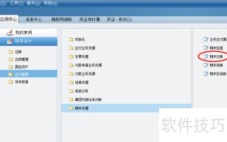 1、 进入财务会计模块,选择应付管理中的期末处理进行对账操作。