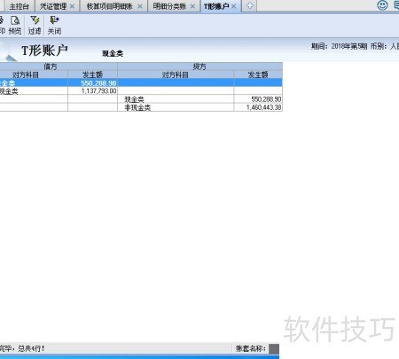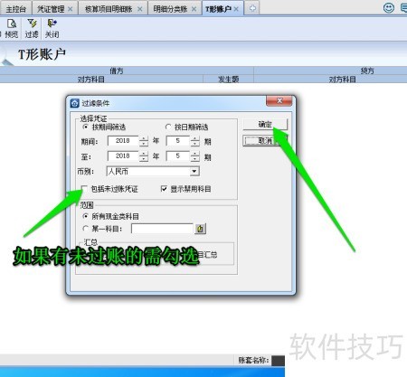 3、 进入T形账户模块后,系统弹出选择对话框,默认显示当前时间,可勾选包含未过账项,确认后继续操作。