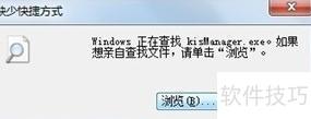 7、 当点击加密服务器提示缺少快捷方式时,可通过浏览找到路径C:WindowsSysWOW64kiscom,在该文件夹中选择名为kismanager.exe的可执行程序,注意务必确认文件后缀为.exe,避免误选其他文件。