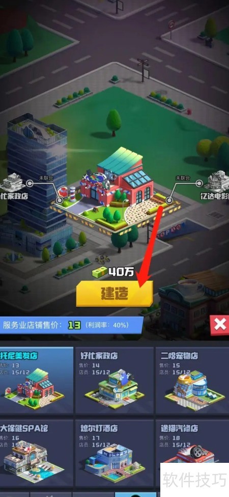 1、 启动明日大亨,点击箭头指向的空地开始建造。