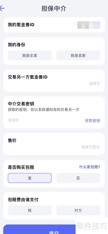4、 输入对方ID、中介密钥、商品价格、是否包赔等信息并提交,系统将自动生成群组,由中介客服引导完成账号核实、合同签署、绑定更换等后续交易步骤。