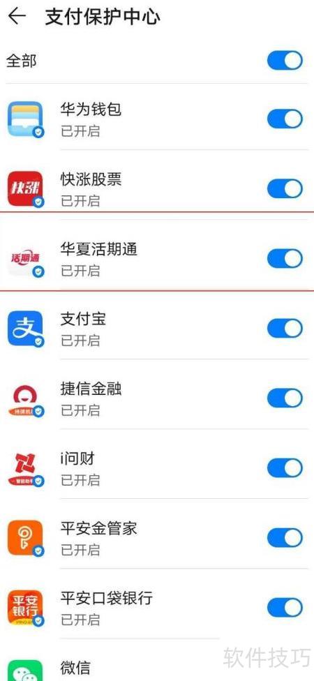 9、 进入支付保护中心,找到华夏活期通,关闭其右侧的开关即可完成操作。
