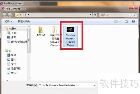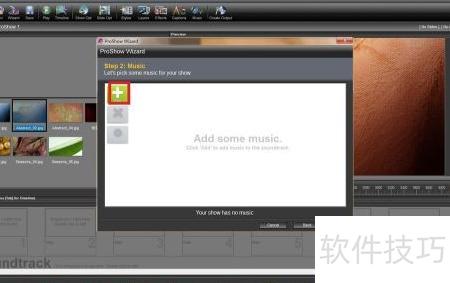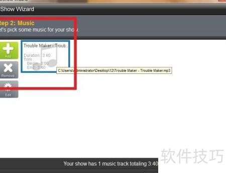 4、 在第二个窗口中,可选择电子相册的背景音乐。点击add按钮,选中Trouble Maker作为配乐,可在窗口中试听预览,确认无误后,点击next进入下一步操作。