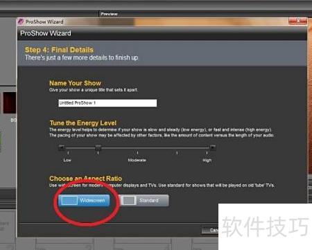 6、 在此窗口可设置项目是否启用宽屏模式,我选择宽屏并点击create,随后可在预览窗口查看效果,确认无误后点击next继续。