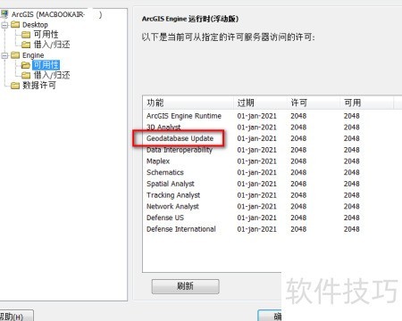 8、 所示,GDB Update许可等同于ArcGIS Engine Enterprise Geodatabase许可。这表明,在ArcGIS Administrator中所显示的Geodatabase Update许可,实际上即为ArcGIS Engine提供的企业级地理数据库更新许可,两者名称不同但实质相同,功能一致,可用于支持对企业级地理数据库的编辑与更新操作,确保用户在分布式环境中具备相应的数据访问和修改权限。