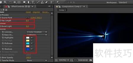 5、 此时调整Shine参数,将光线长度设为8,亮度增强设为9,并将颜色调成蓝色或自选颜色。