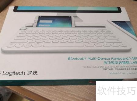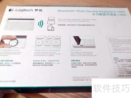 1、 包装盒尺寸较大,正面印有产品使用场景图。下方左侧为罗技中英文标识,右侧以绿色字体标注中英文产品名称及型号多功能蓝牙键盘K480,配色沿用品牌一贯风格,整体设计简洁美观。