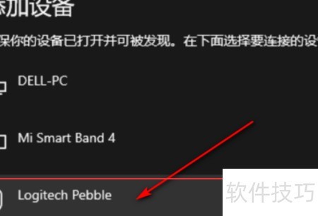 8、 进入新页面后,开启蓝牙功能,搜索附近的蓝牙设备,找到Logitech Pebble并点击连接,待页面显示设备已准备就绪,即表示鼠标连接成功。