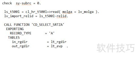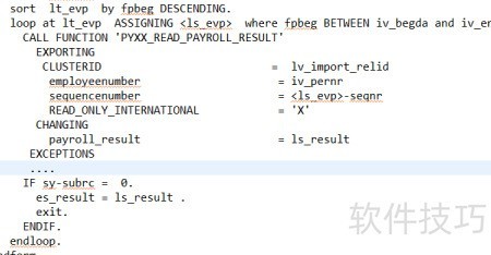 7、 子程序get_payroll_result的具体实现所示,调用了三个功能模块。其中,CU_READ_RGDIR用于从薪资报表中读取核算期间信息;PYXX_READ_PAYROLL_RESULT则根据指定的索引号获取对应的工资数据,通常与CU_READ_RGDIR配合使用,以确保准确提取特定期间的薪酬结果。