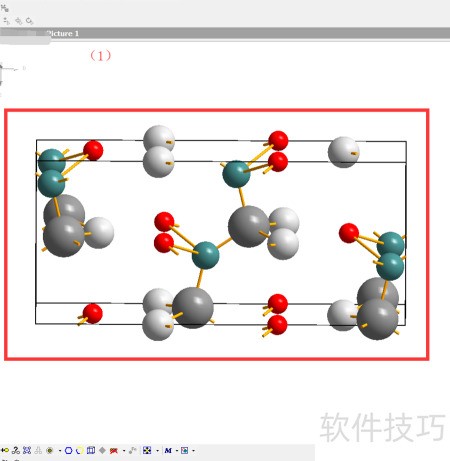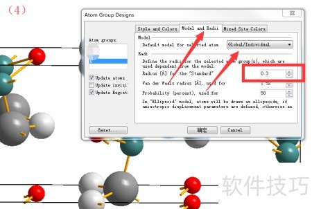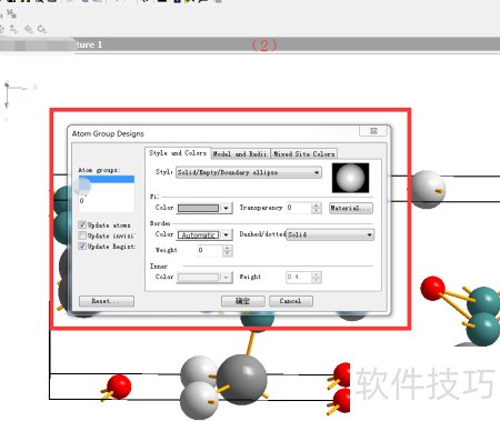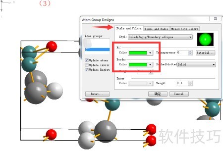 2、 第二步,在获取上述对话框后,可对原子的颜色和尺寸进行调整。以图(3)和图(4)中的氧原子为例,若希望将其设置为亮绿色并采用最小尺寸,操作如下:在atom design对话框中,分别设置氧原子的填充色与边框色,通常两者选用一致的颜色以增强视觉统一性。至于原子大小,则可在model and radii选项中调整其半径值,建议参考元素周期表中各元素的标准原子半径作为依据,以便更准确地反映实际结构特征。完成相关参数设定后,点击确认按钮,系统将立即更新显示效果,最终呈现(5)所示的分子模型,其中氧原子已变为亮绿色且尺寸最小化,整体视图更加清晰直观。