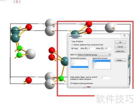 3、 完成原子结构的调整后,接下来需要添加多面体。操作步骤如下:在工具栏中依次点击build→polyhedra→add polyhedra,此时会弹出一个设置对话框,(6)所示。在该对话框中,若希望构建以钙离子为中心、氧离子为配位原子的多面体,需在central atom group选项中选择Ca,在ligand atom group中选择O,设置完成后点击确认按钮,系统便会自动生成相应的多面体结构,结果(7)所示。通过这一操作,可以直观地展示中心原子与周围配位原子之间的空间连接关系。关于多面体样式的进一步细化与参数调整,将在后续内容中详细说明。