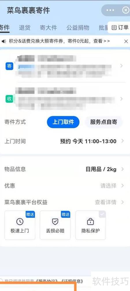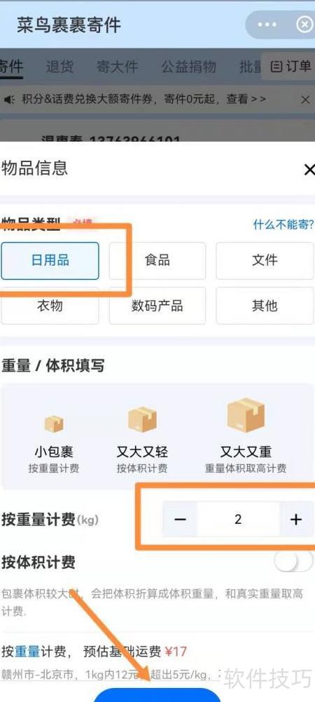 在菜鸟软件中选择寄包裹,输入收发地址,设定物品类型与重量,系统自动计算运费。