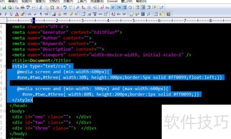 5、 第四步:若需使页面在手机上自适应屏幕尺寸,可使用@media screen设置响应式样式。当屏幕宽度在300px至600px之间时,让三个div元素并排显示,以优化移动端浏览效果。