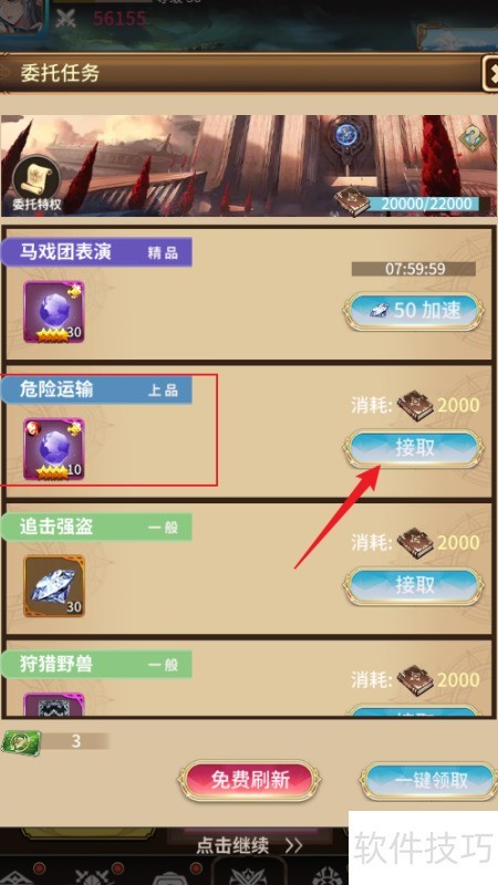 1、 进入冒险委托界面,选取危险运输任务并接取。