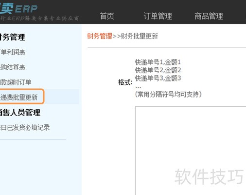2、 速卖ERP能够精准核算每笔订单的实际快递费用。利用快递费批量更新功能,只需将物流公司提供的结算表按指定格式粘贴至输入框,系统即可自动完成费用与订单的精确匹配。