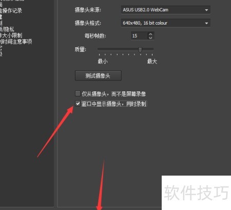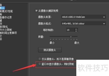 5、 选择摄像头后,勾选同时在窗口显示并录制摄像头画面的选项。