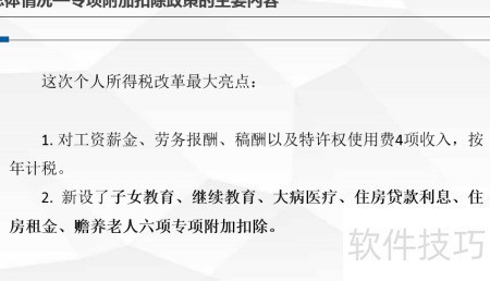 1、 了解个税新政:2018年10月起,个税起征点从3500元上调至5000元;2019年1月1日起全面实施新税制,新增子女教育、继续教育、大病医疗、住房贷款利息、住房租金和赡养老人六项专项附加扣除。
