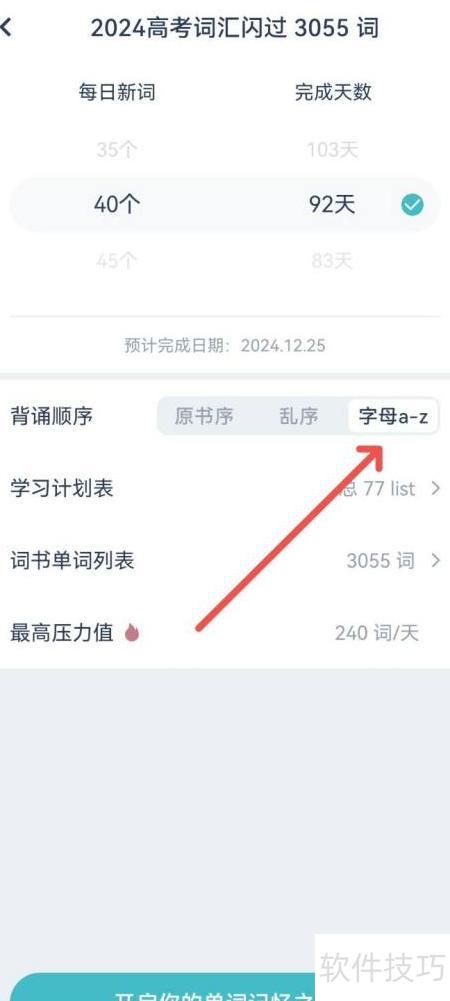 3、 在背诵顺序设置中,点击字母a-z按钮,即可选择按字母顺序进行背诵。