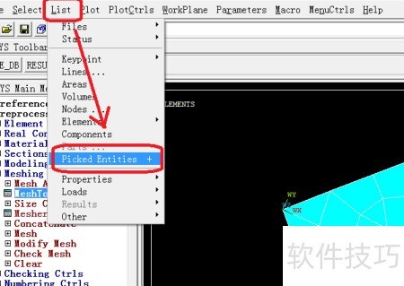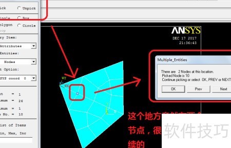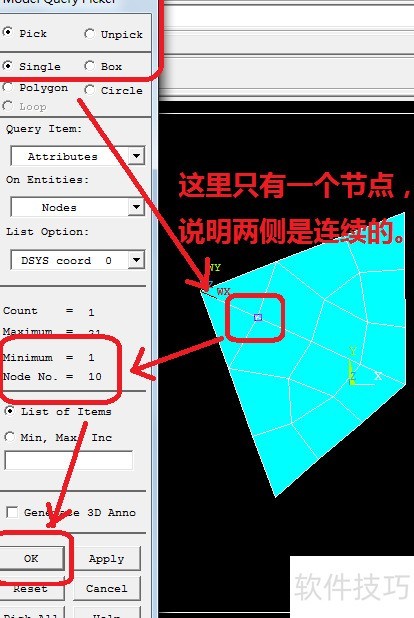 5、 根据图示步骤完成网格划分后,通过查询窗口选取某节点位置时,系统提示发现该处实际存在两个重合节点。这表明虽然网格在视觉上呈现连续状态,但物理上并未真正连接,存在拓扑不连续的问题,影响了模型的连续性判断与后续计算分析的准确性。