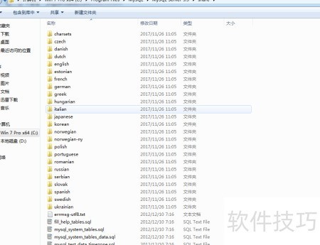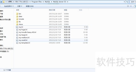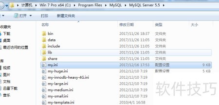 9、 my.ini为MySQL配置文件,位于图中焦点所示位置。