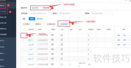 4、 进入业务中心,选择学员档案中的在读或历史学员,点击具体学员后进行学管师分配操作。