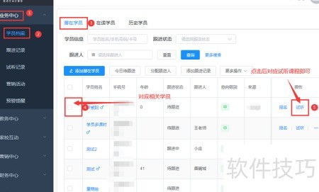 3、 学员试听操作流程:进入业务中心,选择学员档案中的潜在、在读或历史学员,选定具体学员后点击试听,即可开始试听相应课程。