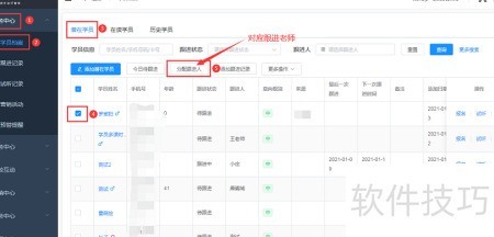1、 进入业务中心,选择学员档案中的潜在、在读或历史学员,为指定学员分配跟进人员。