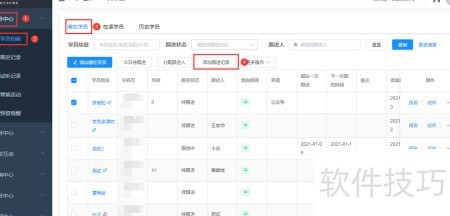 2、 进入业务中心,选择学员档案中的潜在、在读或历史学员,点击对应学员即可添加跟进记录。