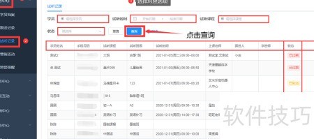 5、 查询跟进记录:进入业务中心,选择跟进记录,填写学员信息与跟进时间后查询。