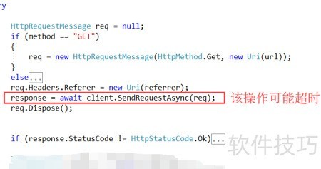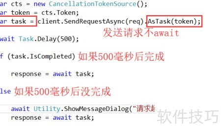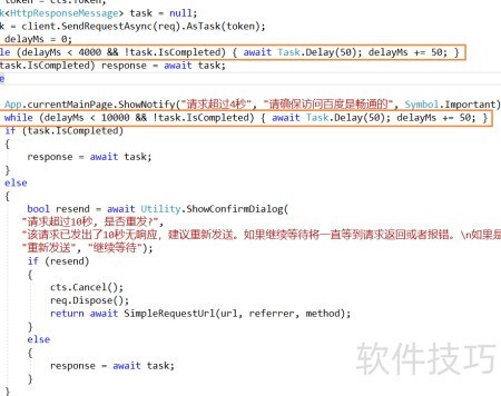 11、 在UWP开发中,图示代码常用于发送网络请求,但使用await时可能长时间无法返回结果,导致程序阻塞,影响用户体验。