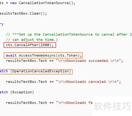 2、 所示,微软开发者文档推荐的写法是:先创建CancellationTokenSource,设置其在指定时间后触发取消,再将cts.Token作为参数传入异步方法中,以支持取消操作。