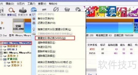 2、 打开DiskGenius软件,在左侧分区列表中定位中毒的U盘,右键点击该U盘,从弹出菜单中选择重建主引导记录选项,操作方法所示。