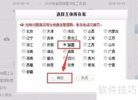 3、 找回备案密码时,系统将弹出选择备案主体所在省份的窗口。根据网站原有的备案号可判断备案省份,正确选择后点击确定即可继续后续操作。