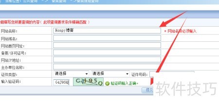 3、 此处提供多种查询方式,若知晓网站备案名称,可选择第一种方法,输入网站名称与验证码后提交即可完成查询。