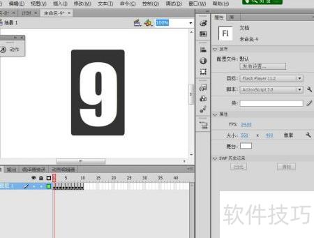 5、 选取第一帧,连续按F6键在第1帧后插入9个关键帧。将第1到第10帧上的数字依次改为9至0,并逐一调整每个数字与背景的居中位置。之所以使用9到0而非0到9,是因为需要实现倒计时效果,使数字牌从9逐个翻转至0。