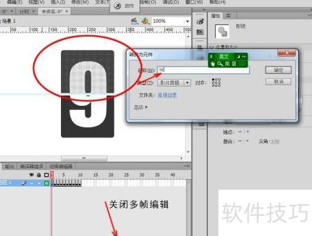 9、 关闭编辑多帧功能,先选中第一帧的上半区域,按下F8键将其转换为影片剪辑,命名为9s(表示数字9的上半部分),接着选中下半区域,同样按F8键转为影片剪辑,命名为9x(表示数字9的下半部分)。依照此方法,依次对后续九个帧的上下两部分进行相同操作,分别创建对应的影片剪辑,并赋予易于辨识的名称。完成操作后,库中将自动生成共20个元件,涵盖十个数字各自的上下半部分。本节内容到此结束,下一节将详细介绍如何实现翻牌动画效果。