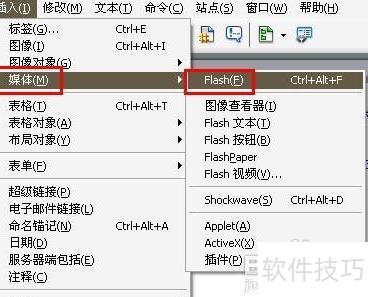 4、 完成前述操作后,即可添加Flash相册,只需点击插入菜单中的媒体选项,选择Flash即可。