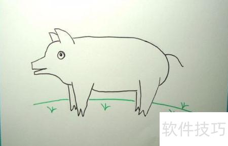 1、 先为孩子画出一只正在散步的小猪简笔画,帮助其建立整体形象认知。引导孩子仔细观察小猪由哪些部分构成,并将其分解为简单的几何形状,如三角形、长方形、圆形等,便于理解和临摹。